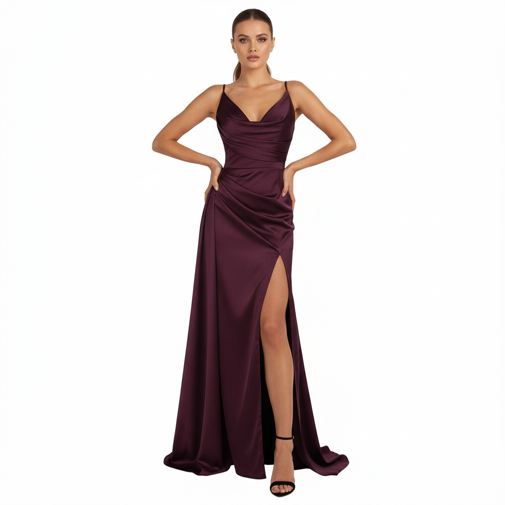 Capture the essence of evening glamour with this exquisite satin gown, designed to command attention. Cut from a lustrous, fluid fabric that drapes beautifully over the form, its high-waisted silhouette cascades into a floor-sweeping skirt, punctuated by a daring thigh-high split. The gown turns to reveal a dramatic, low-cut back, ensuring a memorable impression from every angle. An embodiment of modern elegance, destined for your most distinguished occasions.
